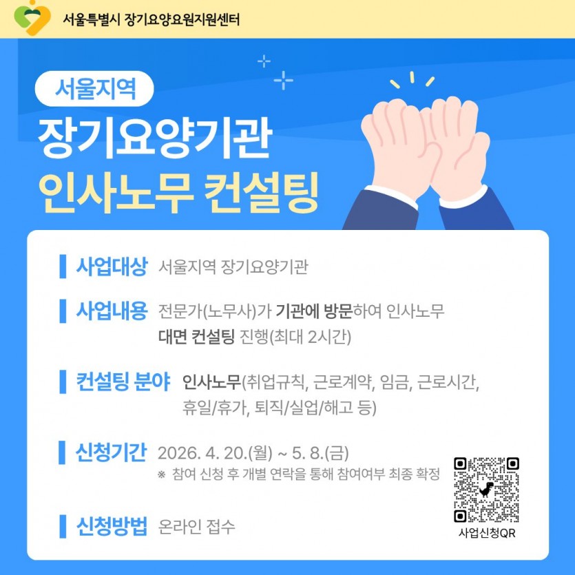 서울특별시 장기요양요원지원센터에서는 장기요양기관의 인사노무 역량강화를 위해 2024년부터 노무사가 찾아가는 <장기요양기관 인사노무 컨설팅> 사업을 운영 중에 있습니다.