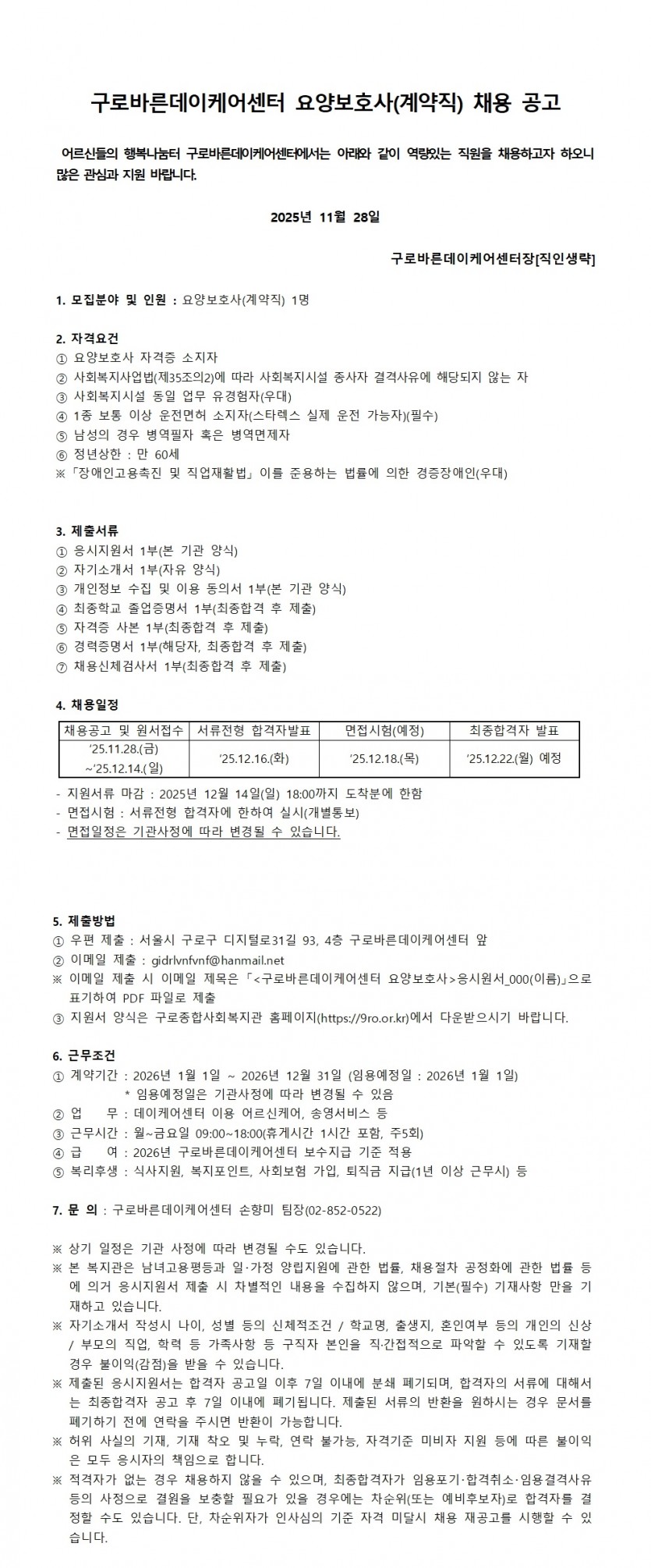 1. 모집분야 및 인원 : 요양보호사(계약직) 1명